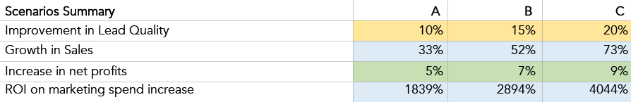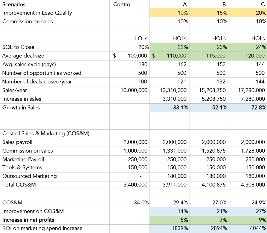 We held all spending constant except for adding a $180,000 a year budget for outsourced marketing that would enable us to improve the quality of leads by 10%, 15%, or 20%. The results are dramatic as summarized below: